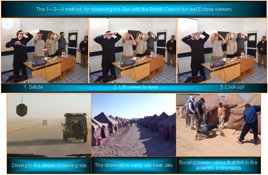 I was therefore invited by the British Council (Libya) to prepare a program of public events coupled with a scientific expedition. The Joint British Council-The Planetary Society expedition would encourage international co-operation, assist in cultural exchange, promote the use of the English language, educate and inform local people on the nature, the historical perspective of Total Solar Eclipses. The expedition was also to demonstrate and inform people on how to safely observe the Total Eclipse. The Planetary Society working with the British Council would form part of the Libyan National Solar Eclipse Public Awareness Campaign.
