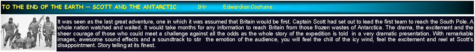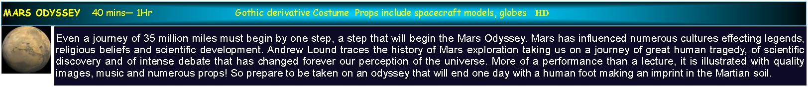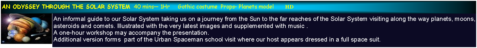 Text Box: A number of the Odyssey Dramatic Presentations have been adapted for use in schools. The general format remains the same however, they are reduced in time and the language is been adapted for the age group required. These presentations are well suited to form part of a project.