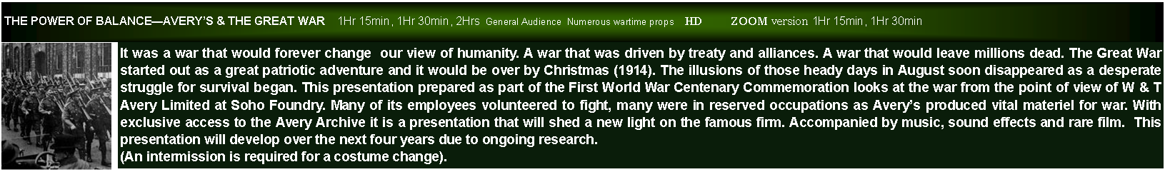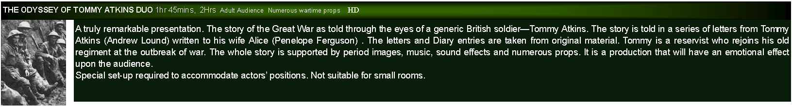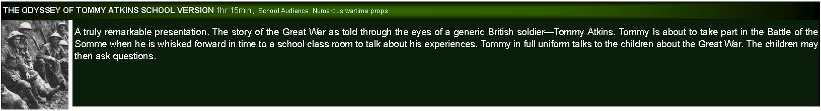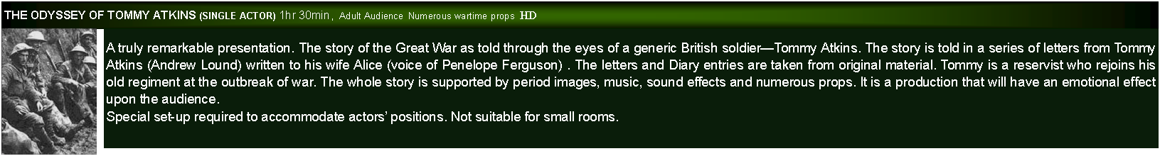 Text Box: The first fully fledged global conflict began in 1914. Over the next few years millions of men would be killed in relentless  fighting.  Millions more civilians would be killed or displaced.  The tragedy of the Great War still resounds today, In commemoration of the centenary of the outbreak, Odyssey Productions® will be producing a number of special presentations that will view the conflict from a variety of points of view.