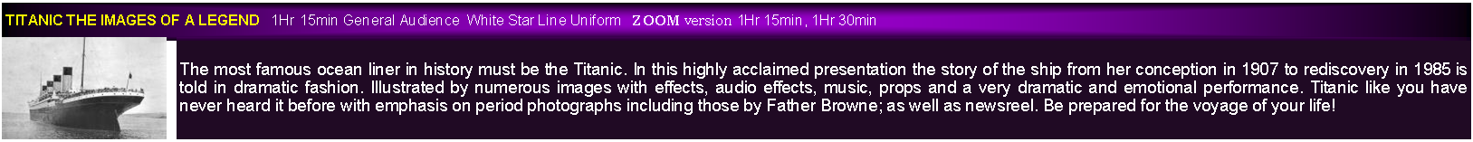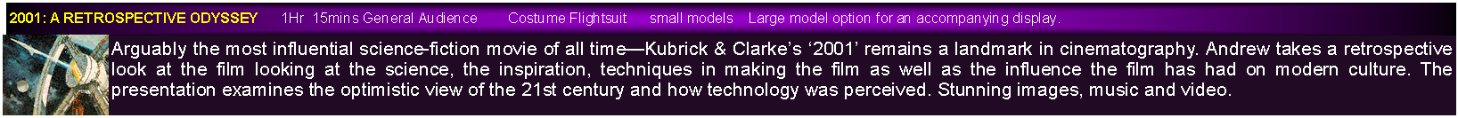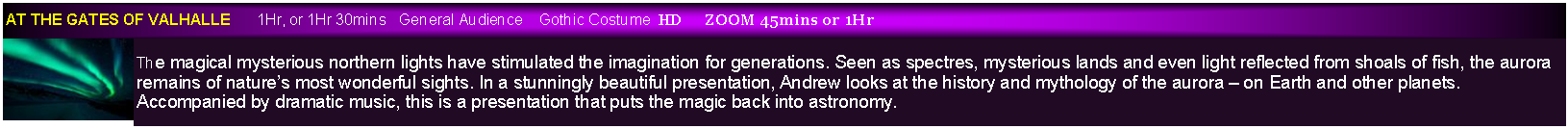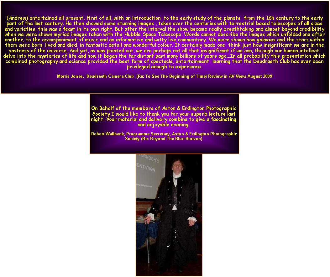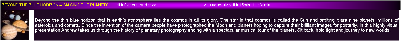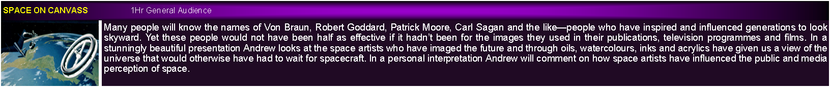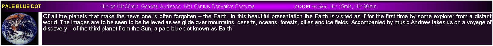 All presentations are designed to appeal to a wide a range of audiences as possible and this includes combining science and art to provide some of the most beautiful presentations you will ever see. All are accompanied by music offering  an audio visual delight.