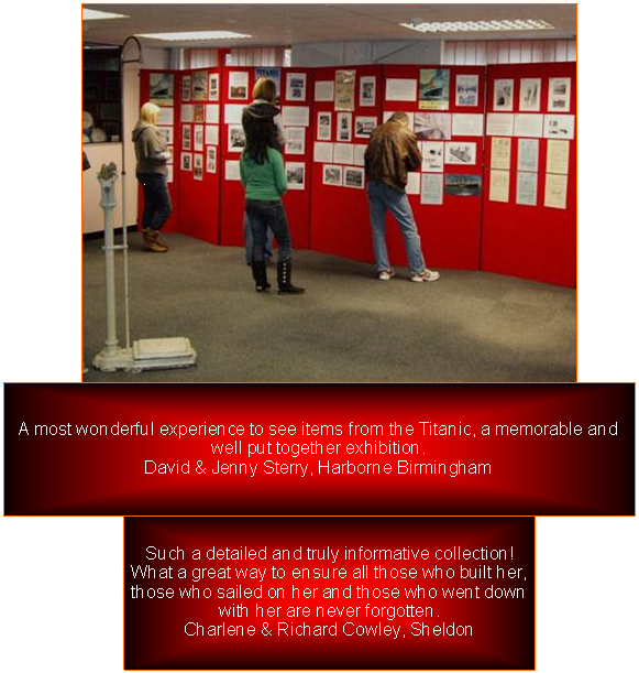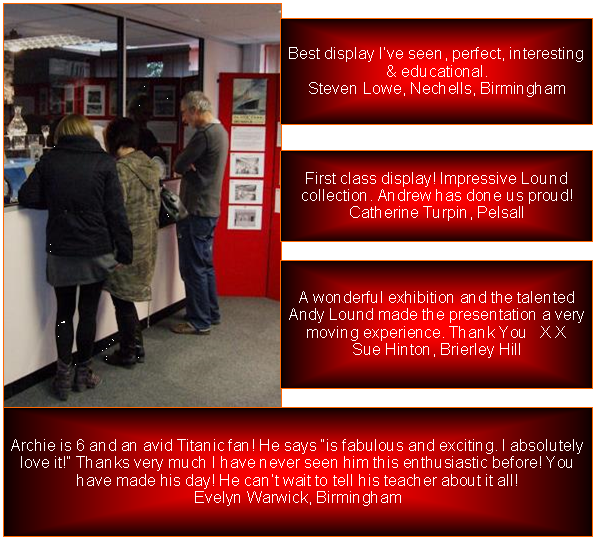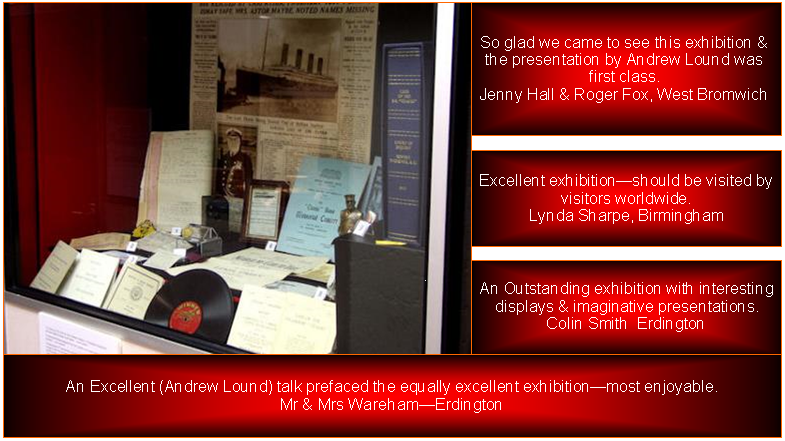 Text Box: Excellent exhibition, a huge amount of work. Fabulous presentation by Andrew Lound in the Avery theatre. A fitting commemoration of the 100th anniversary of the disaster!